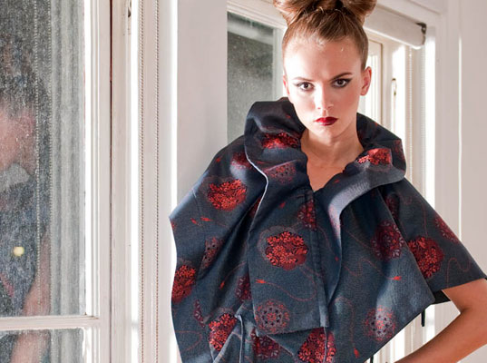 Another designer experimenting with traditional kimono fabrics is Zurich-based Kazu Huggler, who apprenticed with Vivienne Westwood after her studies in Central Saint Martins in London. Her collections embody Japanese aesthetics and Swiss quality, making her creations a wearable symbiosis of both cultures. Born in Tokyo to a Swiss father and a Japanese mother, the designer is also involved in promoting the art of dressmaking, and has donated sewing machines to high schools in the tsunami-hit areas of north-eastern Japan.