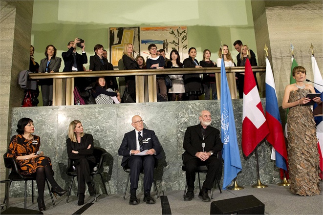 Paola Deda ( right ) Moderator, Chief of the UNECE/FAO Forestry and Timber Section, Maestro Michelangelo Pistoletto ( second from right ) Città dell’Arte Pistoletto Foundation, Mario Boselli ( third from right ) President Italian National Chamber of Fashion, Xenya Cherny-Scanlon ( second from left ) Special Adviser to the Director General, International Union for Conservation of Nature ( IUCN ) and Rossella Ravagli ( left ) Representative of Gucci at the opening of the Fashion Exhibit with a Dance Show during launch of UNECE/FAO “Forests For Fashion – Fashion for Forests”. 21 March 2014. UN Photo / Jean-Marc Ferré
